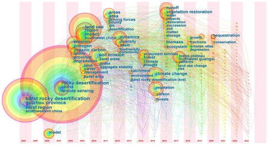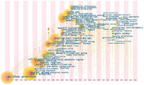 Time zone visualization of hot keywords shows the KD research trends. In the accumulation stage (1995–2005), high-frequency and high-burst keywords included rock desertification (742), karst rocky desertification (489), soil erosion (114), karst areas (75), guizhou province (68), remote sensing (63), karst mountain region (35), southwest China (32), soil and water conservation (22), and ecological control (21). In the development stage (2006–2015), high-frequency and high-burst keywords included soil erosion (60), impact (55), land use (42), forest (39), models (36), benefit evaluation (27), comprehensive control (24), comprehensive treatment (19), human intervention (16), and huajiang (14). In the expansion stage (2016–2023), high-frequency and high-burst keywords included organic carbon (21), ecosystem services (14), ecological industry (13), poverty alleviation (12), agricultural products (11), karst ecosystem (10), green program (9), county demonstration (9), rural revitalization (8), and carbon sequestration (7).