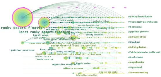 In CiteSpaceV.6.2.R2, “Node Types” is set to “Reference”, “Year Per Slice” is set to “1”, and “Selection Criteria” is set to “g-index = 25” (Figure 9). Through visualization of the co-citations in the literature, the most highly cited study is “Rocky desertification in Southwest China: Impacts, causes, and restoration” by Zhongcheng Jiang et al. (608 times), revealing that the karst rocky desertification has had significant negative impacts on the environment and socio-economic conditions at local and regional scales [176]. The study with the highest centrality is “Spatio-temporal evolution of rocky desertification and its driving forces in karst areas of Northwestern Guangxi, China” by Kelin Wang et al. (centrality 0.18), which points out that the driving forces behind rocky desertification have been increasingly influenced by human activities [177]. The work with the highest half-life is “How types of carbonate rock assemblages constrain the distribution of karst rocky desertified land in Guizhou Province, PR China: phenomena and mechanisms” by Shijie Wang et al. (half-life 4.5), which examines the spatial distribution of karst rocky desertified land and relates it to the different assemblages of basement carbonate rocks [178]. The work with the highest keyword burst is Jiang et al. (burst 20.73) mentioned above [176].