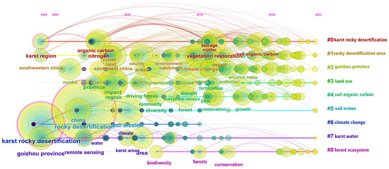 In recent years, KD research has attracted many scholars. Kangning Xiong, a geographer from Guizhou Normal University, defined the concept of KD, formulated the criteria for grading KD, researched the formation mechanism of KD [9], and pioneered scientific control models of KD such as “Huajiang”, “Bijie”, and “Qingzhen” [21,22,23]. He designed and led the construction of the ecosystem function optimization model and the technical path to enhance the supply capacity of ecological products, constructed the rural ecological industry revitalization model, and pointed out how to realize the value of these products [24,25,26,27]. Zhongcheng Jiang, a geologist from the Chinese Academy of Geological Sciences, studied the karst dynamic system [28], proposed a comprehensive strategy for the prevention and control of KD and soil erosion [29], and carried out a survey and research on karst carbon sinks [30]. He carried out an innovative comparative study, established a monitoring station network in the karst critical zone [31], and proposed the demonstration project of carbon sinks for KD control [32]. Kelin Wang, an ecologist from the Chinese Academy of Sciences, studied soil characteristics and vegetation adaptation in KD areas [33], established a monitoring and evaluation system for KD ecosystems [34,35], and researched the response of spatial and temporal changes in the value of ecosystem services to landscape patterns [36]. He innovated and established a scientific and technological poverty alleviation system for ecological control and poverty alleviation and development [37] and proposed a landscape change model to improve the study of karst hydrological and soil processes and landscape design [38]. Currently, key institutions and authors are designing and leading future research directions of KD. Therefore, it is of great significance to elucidate the research situation of KD and point out the direction of future hot research in order to improve the control of KD and improve the forest ecological environment.