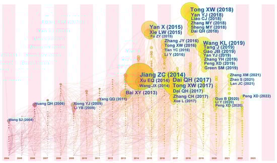 Time zone visualization of the literature co-citations on KD based on WoS from 1 January 1995 to 30 June 2023 [38,40,79,97,99,109,115,130,132,136,142,165,172,176,177,179,180,181,182,183,184,185,186,187,188,189,190,191,192,193,194,195,196,197,198,199,200,201,202,203,204].