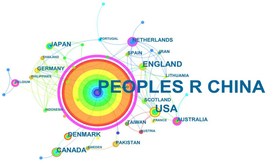 Visualization analysis was conducted on the studies in the WoS database, and the retrieved works came from 50 countries (Figure 10). The results show that China has an absolute advantage in the number of articles published, ranking first in the world, with 634 articles and 1.25 centrality. The second is the US, with a publication volume of 40 articles and a centrality of 0.04. The UK ranks third, with 14 articles and a centrality of 0.06. The others are Canada, Japan, Denmark, The Netherlands, Spain, Germany, etc. China has cooperative relationships with the US, the UK, Canada, and Germany in the study of KD. The US has cooperative relationships with Spain, France, and The Netherlands; the UK has cooperative relationships with Australia and Japan. The main countries of publication have KD distribution. Except for China, most countries and regions mainly study the interrelationships between rocky desertification and hydrology, ecology, and soil due to their mild degrees of desertification, low population density, and low human intervention [205,206,207].