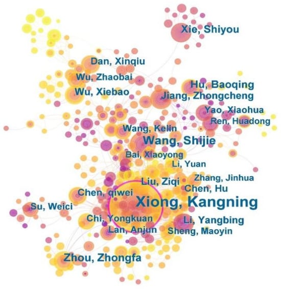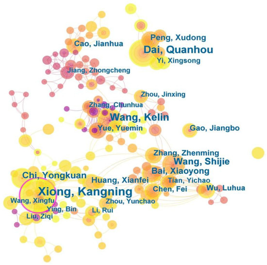 The main academic teams (Figure 11 and Figure 12) include Kangning Xiong, Ziqi Liu, and Yongkuan Chi, who study the classification and grading of the karst desertification by remote sensing and GIS, the relationship between humans and land, the mechanism of formation, forest ecological industry and poverty alleviation, and the control models and technologies [9,45,65,68,162]. The author group that includes Shijie Wang, Xiaoyong Bai, and Zhenming Zhang, among others, is studying the driving mechanism and evolution process of KD, as well as its relationship with landforms, lithology, precipitation, and population [208,209]. The author group that includes Kelin Wang, Yuemin Yue, and Chunhua Zhang is studying karst landscape patterns and dynamic changes in KD, forest ecosystems, and service functions [33,127,189,191].