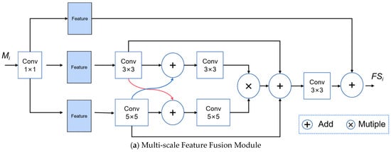The detailed architecture of multi-scale feature fusion module and features conduction module [35]. (a) is the multi-scale feature fusion module used to obtain the FSi. (b) is the feature fusion and conduction module used to obtain the FCi.