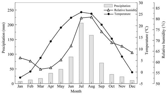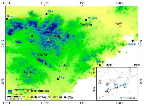 The YMMs are located in Linyi, Shandong Province in the central part of eastern China (Figure 1). The annual precipitation is 717 mm, with the bulk of precipitation occurring predominantly in July and August (Figure 2). The minimum precipitation in January is less than 10 mm, while the maximum precipitation in July is approximately 200 mm. The mean annual temperature is 12.7 °C, with the highest recorded temperature of 25.9 °C in July and the lowest recorded temperature of −2.4 °C in January. The monthly difference in relative humidity is not significant, ranging from 56% to 80%. For this research, Pinus tabuliformis was selected in the sampling site (YMMs, 35°36′ N, 117°51′ E; 1048–1100 m above sea level; Figure 1), and 98 cores were collected from 49 trees. The growing season of Pinus tabulaeformis in the YMMs is from April to October which is also the formation time of tree rings.