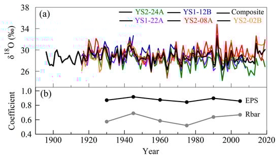 The expressed population signal (EPS) and Rbar (the mean correlation coefficient of individual series) were used to determine the effective length of the tree-ring chronology, and an EPS value greater than 0.85 was considered the threshold for the beginning year of the tree-ring δ18O chronology. Since 1916, there have been three δ18O sequences with EPS values greater than 0.85 (Figure 3). Due to the significant correlation between the core YS1-22A and other sequences during their common time period (1916–2007), the composite series during 1896–1915 containing only the core YS1-22A could also be used to reflect regional tree-ring δ18O changes.
