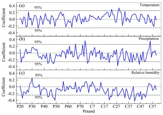 The response analysis of tree rings to climate is usually based on climate data on a monthly timescale, but the correlation between tree-ring chronology and climate on the pentad (five days) timescale is more significant and better reflects the true climate signals recorded in tree rings []. Therefore, we calculated the correlation between tree-ring δ18O and precipitation, temperature, and RH at the pentad scale. The season selected for climate response analysis extends from the twentieth pentad (early April) of the preceding year to the sixtieth pentad (late October) of the current year, considering the influence of the previous year’s climate on tree growth (Figure 4). The correlation between tree-ring δ18O and temperature, precipitation, and RH varied significantly in each pentad, with strong volatility (Figure 4). Tree-ring δ18O was mainly positively correlated with temperature, with a significant correlation occurring in the twenty-third and twenty-ninth pentads of the current year. There was mainly a positive correlation between tree-ring δ18O and precipitation, and the significantly correlated seasons included some pentads in the previous year and the current year (such as the 21st, 43rd, 44th, 47th, and 48th pentads of the previous year, and the 3rd, 21st, 28th, 38th, 40th, and 46th pentads of the current year).