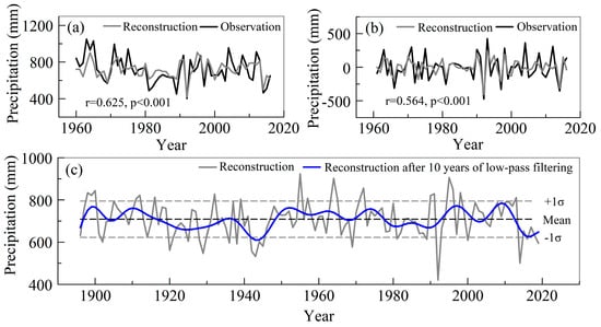 For the modeling period of 1960–2016, the reconstructed precipitation was generally consistent with the observations (Figure 5a), and the first-order differences in the reconstructed and observed precipitation showed similar variations (Figure 5b). The correlation between the first-order differences of the reconstructed and observed precipitation was 0.564 (p < 0.001), which indicates that our reconstruction captured the changes characteristic of the observed precipitation at both high and low frequencies.