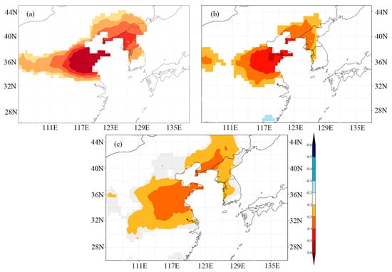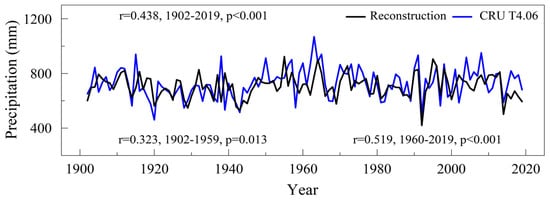 We found that the reconstructed P41–40 can to some extent reflect the PA–J changes. Therefore, we calculated the spatial correlation between the observed and reconstructed P41–40 and CRU gridded PA–J (1960–2016). The spatial correlation pattern between observed P41–40 and CRU precipitation was consistent with that between the reconstructed P41–40 and CRU precipitation (Figure 6a,b), which shows that our reconstruction mainly reflected the precipitation changes in Shandong Province. The correlation between reconstructed precipitation and CRU PA–J from 1902 to 2019 indicates (Figure 6c) that our reconstruction could also, to some extent, reflect regional precipitation changes over the past 100 years.