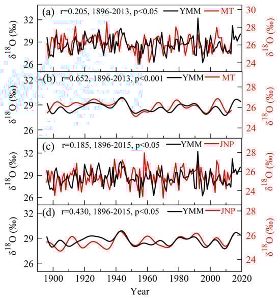 Comparisons between the YMMs tree-ring δ18O series in this study, (a,b) tree-ring δ18O data from Mt. Tianmu (MT) in eastern China [], and (c,d) tree-ring δ18O values from Jirisan National Park (JNP) in southern South Korea []. (a,c) are original series, and (b,d) are 10-year low-pass filter series.