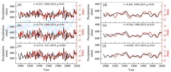 Comparisons between the reconstructed precipitation in the YMMs, (a) the PDO from NOAA based on the ERSST [], (b) the PDO from SWFSC (Southwest Fisheries Science Center) [], and (c) the PDO from the KNMI Climate Explorer based on the HadISST []. (d–f) are the precipitation and PDO after applying a 10-year low-pass filter. The PDO is the monthly mean Pacific Decadal Oscillation (PDO) index from April to July.
