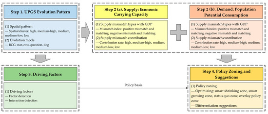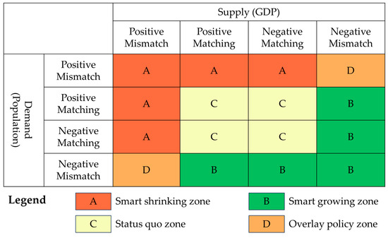 According to the supply–demand mismatch types, this paper proposes a new policy zoning framework for UGPS, in which the UPGS can be divided into four policy zones, namely a smart shrinking zone, smart growing zone, status quo zone, and overlay policy zone (Figure 3). The four policy zones have different development focuses: