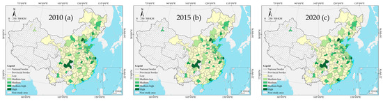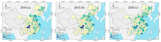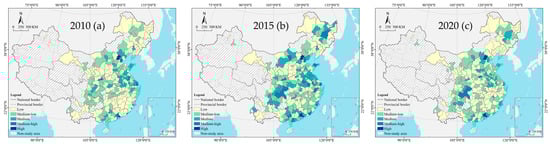 The UPGS area of 286 cities was categorized into five types of high, medium-high, medium, medium-low, and low cities by natural breakpoint (Figure 4). It is clear that the UPGS in China has a relatively stable spatial pattern, generally showing the spatial characteristics of a coastal–inland gradient difference and block-like aggregation in some areas. In 2010, high, medium-high, medium, medium-low, and low cities accounted for 1.40%, 2.80%, 9.79%, 26.22%, and 59.79%, respectively, while accounting for 1.75%, 2.45%, 10.49%, 19.58%, 65.73% in 2015, and 2.10%, 3.50%, 10.49%, 22.73%, 61.19% in 2020. There was a small number of high and medium-high cities, increasing from only 12 in 2012 and 2015 to 15 in 2020. Medium cities are scattered in distribution, mostly including provincial capitals and key cities, with agglomeration appearing in Shandong in 2012, but weakened in 2015 and 2020. Medium-low cities were distributed in blocks, mainly in central and east China, with a small number in the west and northeast, gradually growing into two aggregations in the Shandong Peninsula and the Yangtze River Delta, and appearing in blocks in Inner Mongolia, Liaoning, Hebei, Sichuan, Guangdong, Guangxi, Hunan, Jiangxi, and Henan. Low cities contracted somewhat but remained scattered as a mainstay across most of the country.