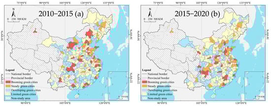The study period was equally divided into 2010–2015 and 2015–2020 to explore the change patterns of UPGS in each time frame (Figure 5). It can be seen that the cities with four types of evolution patterns of UPGS in China showed a “pyramid” structure with a relatively stable number, and the cities with better evolution were found in the central and eastern regions of the country, as well as in the major provincial capitals and key cities. In 2010–2015 and 2015–2020, booming, steady, developing, and limited green cities accounted for 11%, 13%, 28%, 48% and 9%, 15%, 30%, 45%, respectively. Booming green cities included most of the provincial capitals and some key cities, and gradually shrank to the central and eastern regions and the southwest. Steady green cities were further clustered from the central and western parts to the east, gradually developing into three clustering areas in the Beijing-Tianjin-Hebei region, the Shandong Peninsula, and the Yangtze River Delta. Developing green cities were further clustered from the west and north-east towards the center, south and south-west, with a number of contiguous areas taking shape. Limited green cities were widely distributed across most of the country.