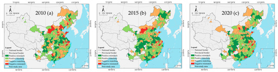 Maps of spatial mismatch types on UPGS and population in 2010, 2015, and 2020.