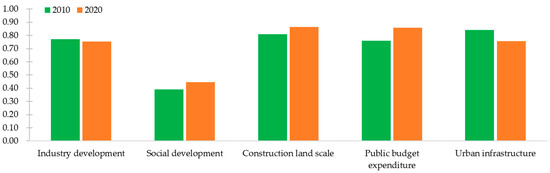 The mean of the five types of independent variable driving factors was calculated (Figure 10). It shows that the strength and ranking of different types of driving forces fluctuated somewhat in both years. In 2012, the driving forces had a minimum value of 0.39, a maximum value of 0.84, and an average value of 0.71, with the social development factor being the weakest and the urban infrastructure factor the strongest. In 2020, the driving forces had values ranging from a minimum of 0.45 to a maximum of 0.86, with an average of 0.74, with the social development factor the weakest, and the construction land scale factor the strongest.