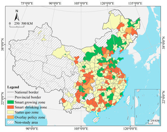 - The 286 cities were grouped into four policy zonings for UPGS based on the types of mismatch between supply and demand in China. The smart shrinking zone should implement smart shrinking strategies for UPGS, the smart growing zone should implement smart growing strategies, the status quo zone should maintain status quo development strategies, and the overlay policy zone should implement shrinking or growing strategies as appropriate.