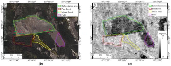 Figure 1 shows the location and scheme of the reforestation area (RA) (green polygons in Figure 1b) and three reference areas (21.9, 14, and 8.9 ha). At present, the age of young stock varies from 1 to 19 years, and its height does not exceed 4 m. Within the first reference area, there is a pine forest (PF) (red polygons in Figure 1b) similar to the forest of the study area in the pre-fire period. The second reference area (yellow polygons in Figure 1b) is a mixed forest (MF) with the following species composition: larch (65%), birch (32%), and pine (3%). The open treeless area is marked with a magenta contour (polygons in Figure 1b) and labeled as a “Field”. Figure 2a shows a photograph of a reforestation site (in the foreground) and a reference site of a mature coniferous forest (in the background). Figure 2b presents a mixed forest picture.