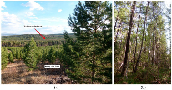 Test site photos: (a) the reforestation site and reference pine forest, (b) mixed forest.