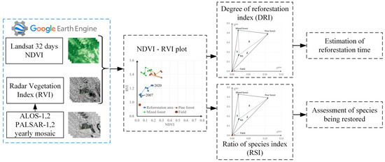 The method is divided into three main parts, as shown in Figure 3. At the first stage, NDVI, NBR, and RVI time series were obtained for all four sites (treeless, mixed forest, coniferous, and the reforestation site (see Figure 1b,c) using Google Earth Engine (GEE) (see the Google Earth Engine box in Figure 3). Next, these time series are considered together on two-dimensional NDVI (abscissa), RVI (ordinate), and NBR (abscissa) and RVI (ordinate) planes (see the NDVI-RVI box in Figure 3). In this case, three time series, except for reforestation site data, are approximated by the following points: the origin of a two-dimensional plane corresponds to the treeless site, and the reference sites of mixed and coniferous mature forests are the corresponding two points in the first quadrant (positive index values). These three points form a triangle, within which the dynamics of the fourth time series, i.e., the reforestation area, are considered (see the DRI and RSI boxes in Figure 3). Two new values are introduced that characterize (1) the degree of reforestation (simultaneous increase in projective cover and aboveground biomass) and (2) the degree of species composition similarity to a mixed or coniferous forest. Finally (see the last two boxes in Figure 3), we obtain the predicted reforestation time and species composition.