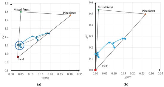 Thus, the totality of all three reference sites (the treeless smooth site, mixed and coniferous forests) makes a triangle area in Figure 5a. It is suggested to address the reforestation dynamics inside this triangle. However, the 2D NBR-RVI distribution does not fit in such a graphic model.