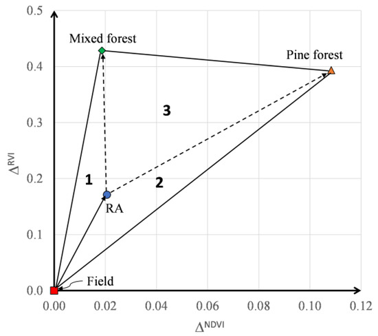 For convenience, we placed the origin at the “Field” point (Figure 5b), and the abscissas and ordinates were the differences between the relevant vegetation indices: