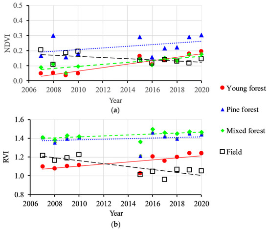 Let us compare the obtained result with the NDVI and RVI time series analyses for all four sites (Figure 7). Additionally, linear trends of the relevant data series are given for better visualization. The rate of NDVI increase for the reforestation site is 3.05- and 5.74-fold higher than mature mixed and pine forests, respectively.