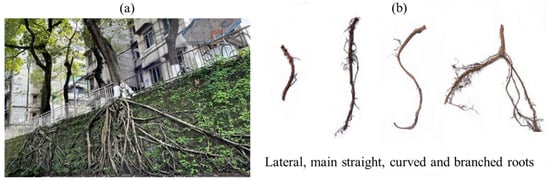 Triaxial tests, due to their intrinsic characteristics, have been popularly applied to measure the shear strength of geomaterials, with no exception for vegetated soils. In this study, the tree species Ficus virens was selected for reinforcing soil slopes, and such a species is not uncommon to see in Chongqing with the following merits: resistance against wind, air pollution, and barren soils; rapid growth; and being easy to plant and flourish (Figure 1a). A preliminary study focuses on Ficus virens seedlings with an average of 2.5 years’ growth for testing. It is observed that there are main straight roots, branched roots, curved roots, lateral roots, and fibrous roots. Comparatively, fibrous roots are short and slender, with many discrepancies in the strength of each root being hard to quantify and hence not considered in the analyses. A single root’s architecture is shown in Figure 1b.