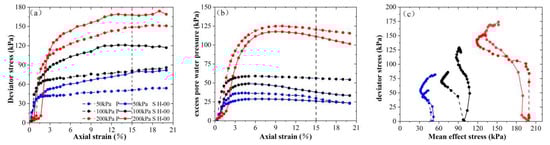After having well prepared the samples, a consolidated and undrained test scheme was adopted under confining pressures of 50 kPa, 100 kPa, and 200 kPa. The shearing rate was set to be 0.1 mm/min, and the tests terminated when the axial displacement reached 20 mm. After testing, the failure point was defined as the peak point of the principal stress difference, (σ1 − σ3)f, when there exists a peak stress, or the point of 15% axial strain in the absence of a peak stress.