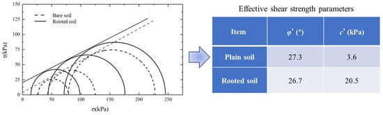 Based on the above test results, Mohr circles are readily plotted, as portrayed in Figure 3. It is found that the Mohr circle of the rooted soil at a confining pressure of 50 kPa (100 kPa) is approximately the same size as plain soil’s at 100 kPa (200 kPa), indicating the significant impact of roots’ mechanical reinforcement on the soil’s strength. A curve fitted with the least-squares method is adopted to approximate the Kf line, based on which the effective stress parameters cohesion, c′, and friction angle, φ′, are obtained for the plain and vegetated soils. It is expected that the roots’ mechanical contribution to soil cohesion is to some extent significant, with its value increasing from 3.6 kPa to 20.5 kPa. Nonetheless, the variation in the soil friction angle modified by the roots can be neglected. This further demonstrates that the simplified model in Section 2.1 is valid for considering root cohesion only when studying the roots’ mechanical reinforcement.