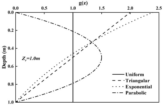 Note that, however, the root system is quite complex, and hence it is rather challenging to precisely quantify the root architecture. Resorting to the analysis software of root images provides a sound avenue to quantitatively characterize the roots’ geometrical properties and hence is suggested to be implemented into sophisticated numerical modelling. For ease of simplification, the root architecture is categorized into four commonly used types: uniform [], triangular [], parabolic [], and exponential [] distributions. Assuming the same biomass, the g(z) function can be ideally written as