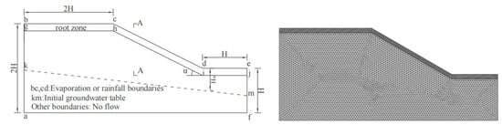 For a root-reinforced soil slope with its geometrical and boundary conditions shown in Figure 5, the groundwater level is beneath the slope toe elevation, and the sloping surface is subjected to evaporation or rainfall. The upper layer represents the root zone, in which a finer mesh is necessitated in numerical modelling. A total of 12,584 triangular elements are generated. Resorting to COMSOL Multiphysics software, a coupled seepage–stress finite element analysis is carried out in this study.