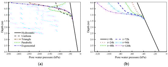 In unsaturated soil mechanics, the determination of the (negative) pore water pressure (PWP) is a key and fundamental issue. For one-dimensional steady seepage such as under evaporation or infiltration, analytical solutions for the matric suction (negative PWP) and the effective degree of saturation were derived in closed form []. For considering the hydrological effects of vegetated soils, PWP distributions along depth are suggested to be obtained in a numerical manner. Figure 6a shows the effects of different root architectures on the matric suction under transpiration conditions, and it is found that the influence zone of root water uptake exceeds the root length. Provided that the root biomass is the same, the exponential and triangular roots have a much more significant effect on the improvement in the matric suction, particularly near the ground surface, owing to their larger root densities and hence higher transpiration rates. Comparatively, uniform and parabolic root patterns induce much less-negative PWPs, and the maximum suction appears at around half the root depth. Overall, the previous two kinds of architecture outperform the latter two in the improvement in the soil suction. Moreover, the PWP distributions are similar to those obtained in the existing literature and, more importantly, are directly related to the root architecture, as presented in Figure 4. Taking a uniform root as an example, the PWP variations against the transpiration time and depth are illustrated in Figure 6b. Initially, it reflects a steady state, and the PWP follows a hydrostatic line. As time goes by, the PWP curve gradually deviates outwards to induce higher matric suction by root water uptake. Its magnitude changes nonlinearly and becomes gradually significant with time. This demonstrates that unsaturated soils tend to have larger shear strengths in a transpiration state based on the extended MC failure criterion.