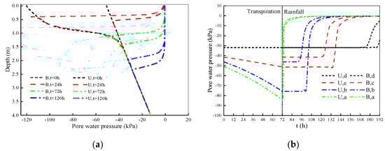 Rainfall is not uncommon and usually presents periodic characteristics in a specific region. When a vegetated slope is subjected to rainfall, the initial condition right before the start of rainfall is supposed to be determined as a prerequisite, which would directly affect the response of the PWP and slope stability solutions. For example, the PWP at the ground surface is negative 120 kPa for a soil slope reinforced by uniform roots (denoted as U), as shown in Figure 6 and the t = 0 line in Figure 7a. In contrast, it is only 51 kPa for a bare slope (denoted as B). Afterwards, rainfall starts and it is within expectation that PWP drops significantly in shallow depths. Because of rainfall infiltration, the suction drops to zero instantly near the ground, regardless of bare or rooted slopes. Although the difference between the PWP values is not very varied at those depths where air voids are mainly occupied by rainfall water, it is still a little bit larger for a vegetated slope. However, a much larger suction (negative PWP) is preserved in those depths that water does not reach. Moreover, at a certain depth, rooted soils have a higher suction value in contrast to the bare soil, which is mainly attributed to the lower permeability of the root–soil composite, even during rainfall. This is definitely suited to the case when rainfall time is not long enough; otherwise, all pores would be filled with water, and in this case, it becomes a fully saturated soil slope in which the hydrological effects of vegetation ought to be neglected. The same phenomenon can be observed from the PWP evolution along the section A-A on the sloping surface, which is 1.83 m away from point c in the horizontal direction in Figure 5, where the PWP at depths of 0, 0.5 zr, zr, and 2 zr (corresponding to a, b, c, and d) is simulated under a total of 72 h of transpiration and thereafter 120 h of rainfall. For ease of illustration, the PWP contours for the bare and vegetated soil slopes are also presented in Figure 8 under rainfall conditions. Intuitively, the suction for the vegetated soil slope is more retained after 24 h rainfall in contrast to the base slope. After a long period of rainfall, for example, 120 h, one can observe that the contours become similar, with not many discrepancies between the two. This demonstrates that the hydrological effect of roots gradually weakens with rainfall infiltration, which was also substantiated by Ng et al. [] and Feng et al. [], who investigated an infinite slope.