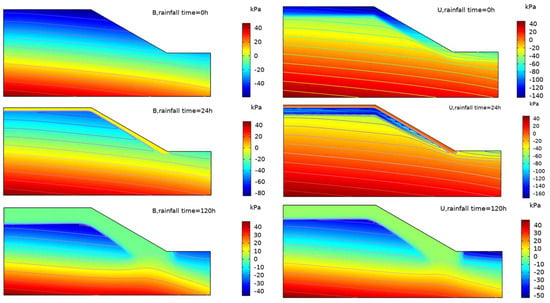 PWP contours for bare and rooted soil slopes against rainfall time. (Note: B represents bare slope, and U represents vegetated slope with uniformly distributed roots).