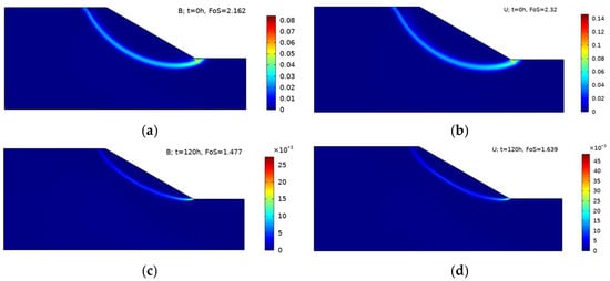 Based on the shear strength and hydrological parameters, the factor of safety (FoS) for the rooted soil slope is 2.320 after 72 h of plant transpiration, and it is 2.162 for the bare slope. This indicates that vegetation could improve slope stability, and the degree of improvement is determined by its properties. The corresponding plastic strain contours are shown in Figure 9a,b. The plastic shear band (or critical slip surface) shows that a relatively deep failure mode is induced at the limit state in the presence of roots. This is due to the additional resistance stemming from the roots’ mechanical and hydrological reinforcements, thereby requiring deeper soils to be mobilized to reach the limit equilibrium state. Nonetheless, the slope stability is significantly weakened under rainfall infiltration. For instance, the factor of safety drops to 1.477 for the bare slope and 1.639 for the rooted soil slope after 120 h of rainfall. In this case, the higher FoS is predominantly attributed to the mechanical reinforcement of the roots, and the hydrological effect is minimal because plant transpiration ceases and only a certain amount of suction is preserved, which can be seen in Figure 8. Correspondingly, the plastic shear strain is also obtained, as illustrated in Figure 9c,d. It is shown that a much shallower failure mechanism results from rainfall, although a relatively deep slip surface can also be observed for the vegetated slope. In other words, the use of vegetation is capable of preventing shallow slope failure under rainfall because the plant species used in practice usually do not have long roots. Moreover, this has also been proven to be valid for the prevention of scouring and erosion.