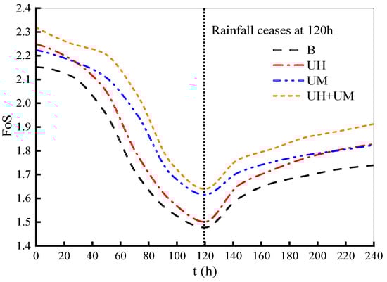 It has been widely acknowledged that vegetation could improve slope stability through its mechanical and hydrological reinforcement mechanisms. In an effort to investigate these two effects on slope stability, the single or combined contribution to the factor of safety is discussed herein, and the results are presented in Figure 10 with/without considering rainfall. Following the preceding analysis, where rainfall starts at t = 0, it is as expected that rainfall infiltration results in a sharp decrease in the FoS. Initially, the contribution of the hydrological reinforcement (UH) to the FoS is larger than that of the mechanical effect (UM). However, the FoS computed from the UH experiences a gradual downward trend when rainfall starts for a short time, for example, less than 40 h here, owing to a small amount of water infiltrating into upper soils, and hence a certain amount of matric suction is still preserved. Afterwards, the UH effect is greatly undermined with an increasing amount of water infiltration. At t = 120 h, the FoS from the UH approaches that of the bare slope, and if rainfall continues for enough time, the same FoS would be obtained. In other words, the FoS curve from the UH gradually approaches that of the bare slope, and the curve from the UM would be close to that obtained considering the combined effects (UH + UM) during persistent rainfall. This indicates that the roots’ reinforcement contribution to the improvement in slope stability is principally contributed to by the mechanical effect. When rainfall lasts for 120 h and then suddenly stops, one can find that an obvious increase in the FoS is induced. This is sensible since, in this case, vegetation starts to transpire and water is gradually taken up by the roots. As time goes by under plant transpiration, the hydrological effect becomes significant and gradually exceeds the mechanical contribution. It is worth pointing out that the mechanical reinforcement is assumed to not be affected by atmospheric conditions, which only influence the hydrological effect. Therefore, the FoS value, considering a single reinforcement effect (UH or UM), ought to be no less than that of the bare slope and no more than that obtained with considerations of the coupled hydro-mechanical effects, demonstrating the reinforcement contribution of roots for improving slope stability. Without considering these effects, the obtained results are deemed conservative. In specific engineering practices, the use of vegetation could bring about economical effects or be considered redundant for slope stability.