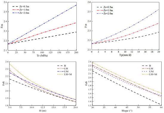 In the following simulations, the default input parameters are slope angle = 30°; slope height, H = 5 m; groundwater level, Hw = 2.5 m; c′ = 3.6 kPa; φ′ = 27.3°; root depth, zr = 1 m; Tp = 10 mm/d; kRAR = 0.03%; Tr = 50 MPa; ks = 1.516 × 10−6 m/s; θs = 0.469; θr = 0.106; α = 1.06 m−1; n = 1.395; and rainfall intensity, q = 2.5 mm/h. Based on these, the pore water pressure in transient states and stability solutions are simulated.