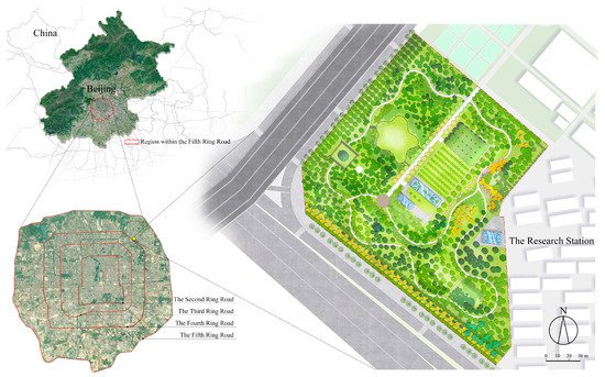 The first National Level Scientific Observation and Research Station for Urban Green Space Ecosystem is located in Huajiadi, Chaoyang District, Beijing (116°27′54.84″ E, 39°58′32.49″ N). The research station was established after careful consideration of factors that included the natural attributes of the area, economic conditions, social conditions, and the scale of the city. The research station is an important part of the China Terrestrial Ecosystem Research Network (CTERN) and is primarily used for monitoring the development and evolution of urban ecosystems. This research institution shares similarities with other types of ecosystem-positioning-observation research stations, with its design and spatial layout serving as the foundation for scientific positioning observation [27].
