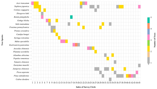 Sophora japonica (17.48%) and Acer truncatum (12.62%) account for a large proportion of the total broad-leaved tree species. Pinus tabuliformis was the most numerous conifer, accounting for 50% of the conifer stems. Nine survey circles (20% of the total) contained a single tree species, while thirty-six survey circles contained two or more species. Twenty-six survey circles (57.78% of the total) contained only broad-leaved species, seven circles (15.56%) contained only conifers, and twelve survey circles (26.66%) contained both broad-leaves trees and conifers.