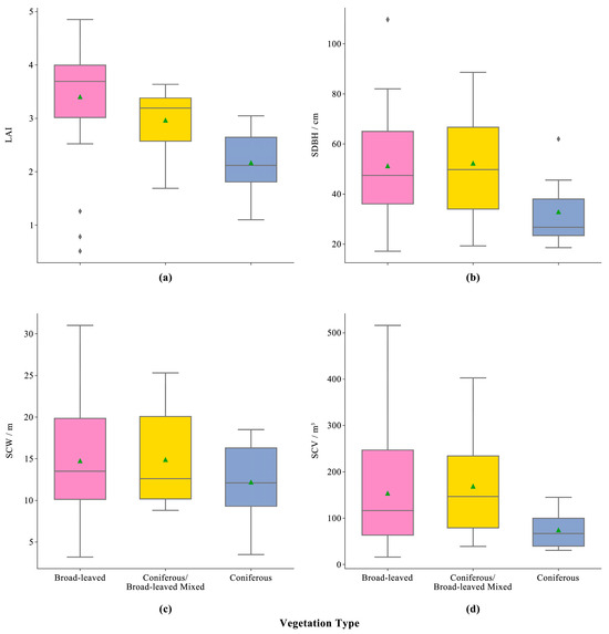 (a) Distribution characteristics of the LAI, (b) the sum of the diameter at breast height (DBH) measurements of trees within the circle (SDBH), (c) the sum of crown width measurements of trees within the circle (SCW), and (d) the sum of crown volume measurements of trees within the circle (SCV) in broad-leaved, coniferous, and coniferous/broad-leaved mixed units. The rhombus represents quilters, and the triangles represents the mean of data.