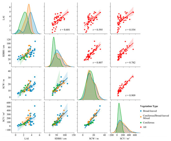Correlations among indices. The figures on the diagonal are the distribution curves of LAI, SDBH, SCW, and SCV in the different types of sampling units. Below the diagonal are correlation scatter plots of the four indicators separated by vegetation type. Above the diagonal are correlation scatter plots for the four indicators in the pooled population of sampling units.