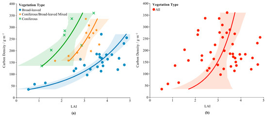Subsequently, log-linear regressions were performed with C density as the dependent variable and LAI as the independent variable. The results showed that LAI could explain 70.6% of the variance in C density in broad-leaved units (all p < 0.05), 54.5% of C-density variance in coniferous/broad-leaved mixed units, and 62.3% of variance in coniferous units (Table 2, Figure 7). A log-linear regression was also performed on the pooled population of sampling units, but due to differences in linear relationships and the wide scatter of data among types of sampling units, the regression captured a relatively low but significant (p < 0.01) 15.9% of C-density variance.