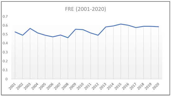 The forest resource efficiency (FRE) trend exhibited notable fluctuations throughout the study period. Initially, there was a gradual increase in FRE from 2001 to 2003, indicating an improvement in the efficient utilization of forest resources. However, this positive trend was reversed, and the FRE started to decline, reaching a low point of 0.4612 in 2008. Notably, in 2009, there was rapid and substantial growth in FRE, with a value of 0.5579. Following this spike, the FRE had a consistent and gradual upward trajectory. Particularly noteworthy are 2015, 2016, and 2018, when the FRE reached its peak levels. These years signify that the Chinese provinces successfully implemented highly effective operational strategies to optimize the utilization of their forest resources. These periods of peak efficiency serve as examples of the best practices in sustainable forestry management, highlighting the potential for improved resource utilization in other years. Studies have proven that the policies of the Chinese central government have led to this growth in forest resource efficiency. The increase in forest resource efficiency (FRE) in 2009 was attributed to various factors, such as potential policy changes, technological advancements, heightened environmental awareness, shifting market demands, capacity development, or external influences [,]. The results of the FRE in the group frontier are relatively better than in the meta-frontier. This demonstrates that provinces perform better in their group frontier compared to the meta-analysis. The average FRE in the group frontier is 0.8240, which indicates growth in forest resource utilization; however, there is still potential of 17.60%. TGR represents the technological gap ratio between the meta-frontier and group frontier. The value of 0.6582 for TGR indicates a massive technological gap over the study period. A TGR value of 1 indicates no gap between the technology utilized by the group and the meta-frontier.