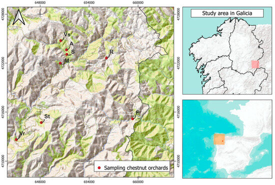 Map of the study area showing chestnut orchard locations. Coordinate system ETRS89/UTM zone 29N (EPSG: 25829).