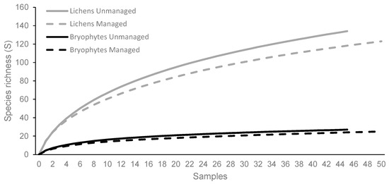 Species accumulation curves’ slopes tended to stabilise towards the end, especially for bryophytes, suggesting that, although the species richness would increase with increasing sample sizes, this increase would be limited (Figure 3). The total number of species recorded was much higher for lichens than for bryophytes and in both cases higher in unmanaged than in managed stands, although very slightly in the case of bryophytes (two species more). We recorded a total of 167 lichen taxa (146 identified at the species level and 21 at the genus level) in 70 genera and in all sampled plots (in both managed and unmanaged stands, in all sites, orientations, and heights in the tree trunks (Table S1). The total number of bryophyte taxa was 32, in 21 genera, in all the sampled plots (Table S2).