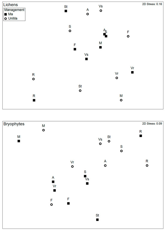 Functional composition. NMDS ordinations showing Bray–Curtis similarities between managed and unmanaged stands of each site in the functional trait space, for lichens (top) and bryophytes (bottom), respectively. Abbreviations correspond to plots.