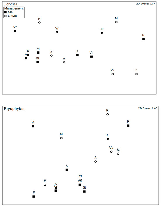 The NMDS ordination of taxonomic composition (Figure 5) shows some aggregation of samples by management for both lichens and bryophytes, but despite its significant effect, there was no clear separation between managed and unmanaged stands since the taxonomic composition was also affected by the site and the effect of management differed between those sites, as shown in Table 3.