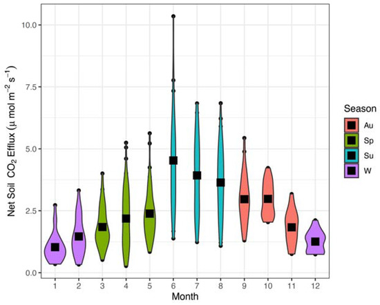 Violin plots of soil CO2 efflux values (μmol CO2 m−2 s−1) by month throughout sampling period (2008–2023). Colors represent distinct seasons: winter (W; purple), spring (Sp; green), summer (Su; blue), and autumn (Au; orange). Black boxes represent the mean for each group, while colored shapes and points represent the data distribution and outlier values.