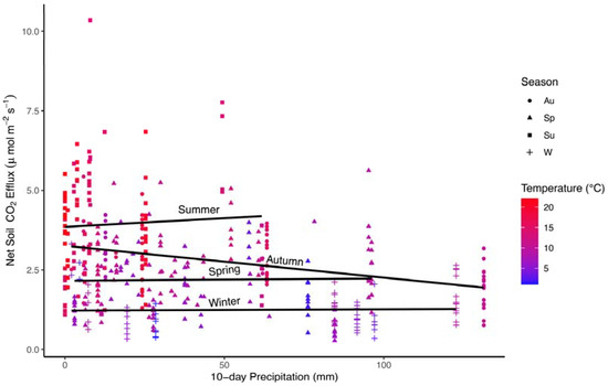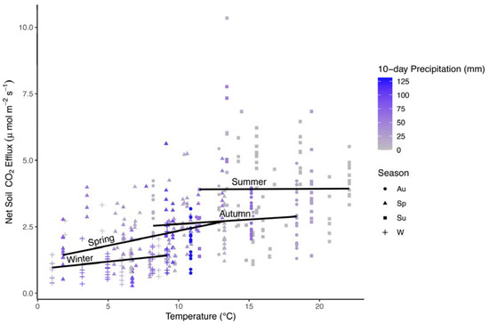 Scatterplot of average monthly Fs values (μmol CO2 m−2 s−1) by air temperature (°C) in all four seasons. Lines are fit to data independently within each season. Colors represent summative precipitation values (mm) for 10 days prior to measurements. Shapes represent different seasons for autumn (Au; circles), spring (Sp; triangles), summer (Su; squares), and winter (W; crosses).