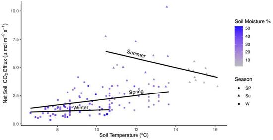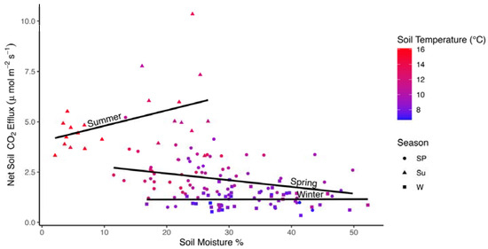 Scatterplot of average monthly Fs values (μmol CO2 m−2 s−1) by soil moisture (%) for a subset of data in in all three seasons where data were available. Lines are fit to data independently within each season. Colors represent soil temperature (°C). Shapes reflect seasons: spring (Sp; circles), summer (Su; triangles), and winter (W; squares).